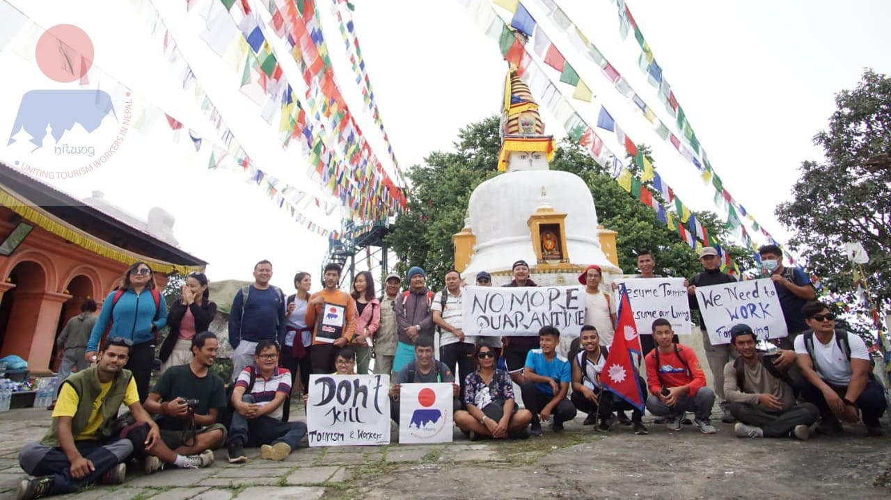 Campaigner NITWOG on the second day of “Let’s Resume Tourism” displayed posters in Jamacho gumba with slogans such as Don’t Kill Tourism & Workers, We Need Work for Live, Respect Our Skills and Knowledge, No More Quarantine, Resume Tourism Resume and Living.
